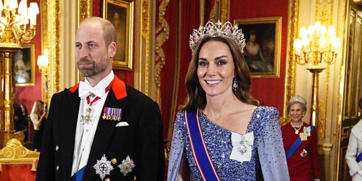 خلال مأدبة عشاء رسمية على شرف الرئيس الألماني فرانك-فالتر شتاينماير، وصلت أميرة ويلز إلى قلعة وندسور بإطلالة آسرة، حيث تألقت بفستان أزرق مرصّع بالترتر من تصميم جيني باكهام، واكتملت الإطلالة بتاج تاريخي نادر لم يظهر في المناسبات العامة منذ عقود، ما أضفى لمسة ملكية استثنائية على ظهورها.