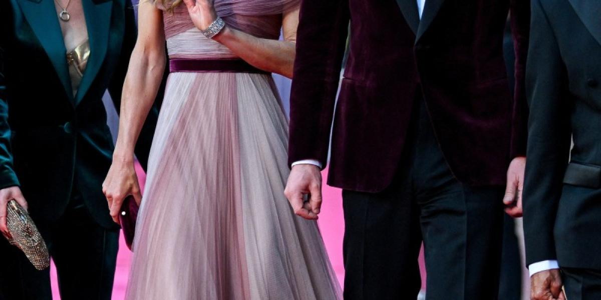 وأطّلت كيت ميدلتون أميرة ويلز على السجادة الحمراء بأناقتها المعتادة برفقة زوجها الأمير ويليام وأبهرت الجمهور بإطلالة ناعمة عبارة عن فستان طويل باللون الأبيض من Alexandre McQueen، صمم بقصة الكتف المائل المزين بوشاح متدلي بطول الفستان.