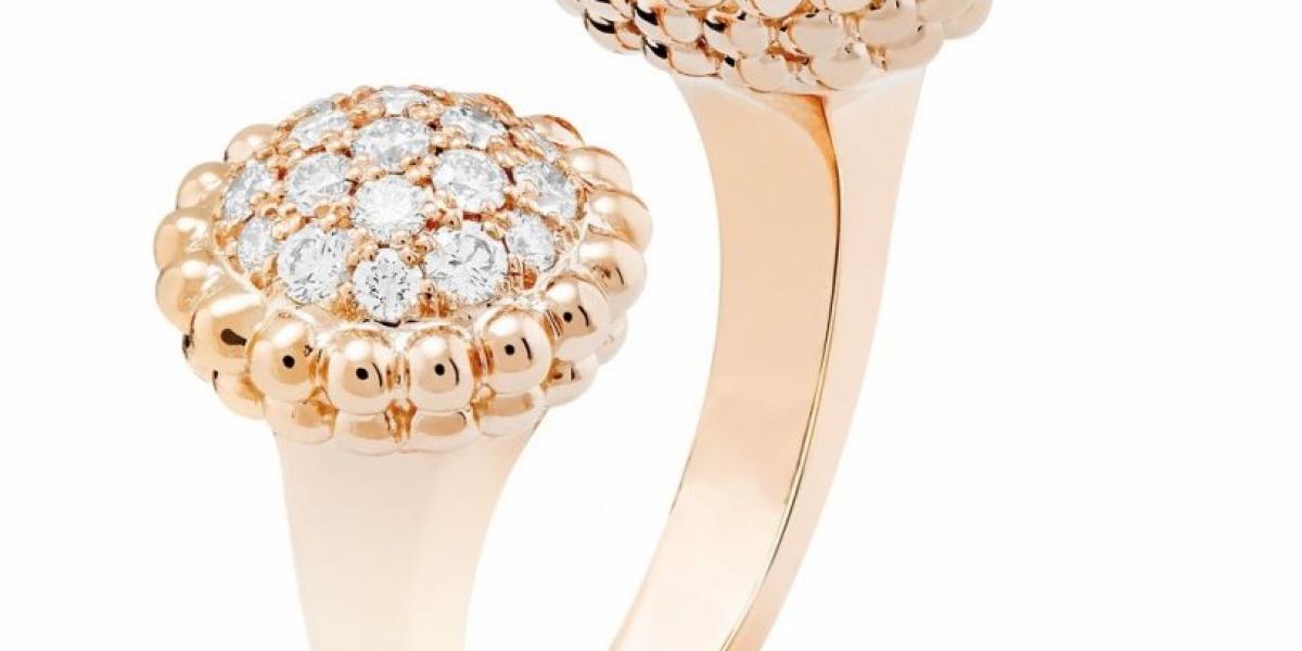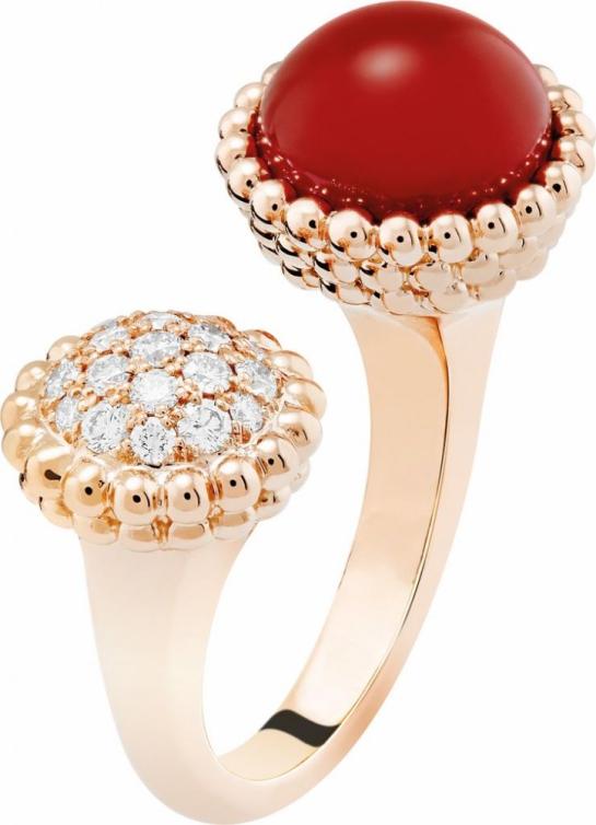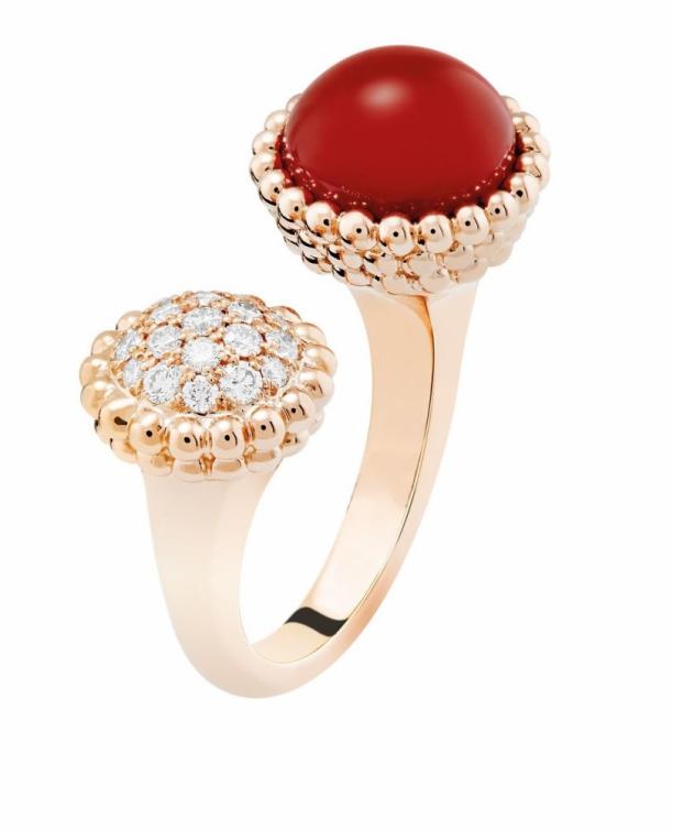 من علامة فان كليف أند أربلز نختار خاتم رقيق بتصميم مفتوح من مجموعة Perlee يتألق بجمال الذهب الأصفر والماس وحجر الكارنيليان.