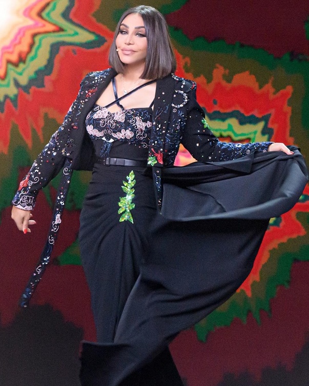 من بين الإطلالات الكلاسيكية التي ظهرت بها أحلام في البرنامج كذلك، عندما ارتدت تنورة سوداء منفوشة ونسقت معها توب أسود مرصع بالكريستالات، وفوقهما بليزر باللون الأسود كذلك بأكمام طويلة، ووضعت أحزمة جلدية على منطقة الخصر واختارتها باللون الأسود أيضًا.