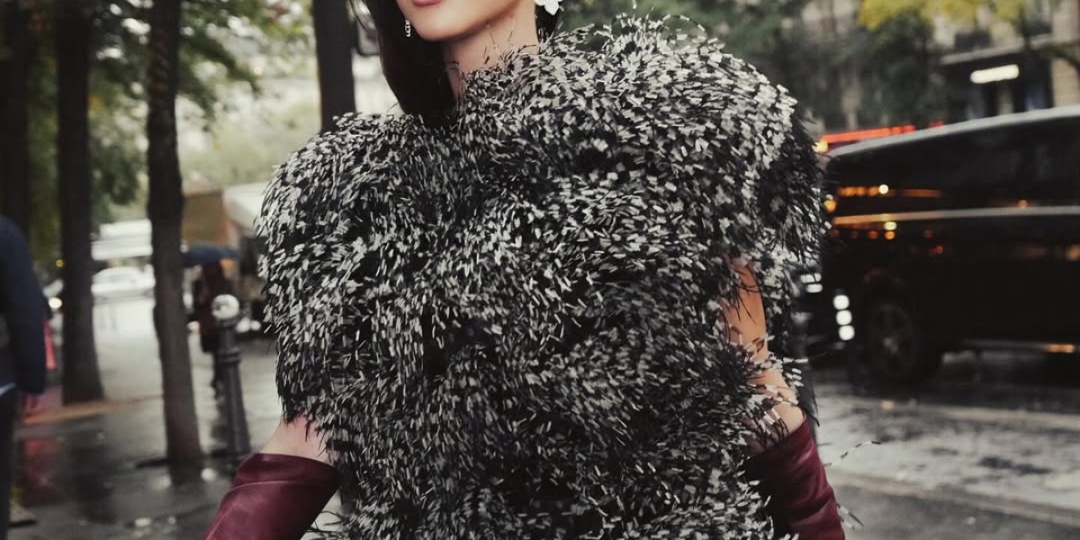 حيث وضعت فوق كتفيها جاكيت من الجلد اللامع، مع قفاز قصير مكشوف الأصابع يغطي الكف فقط، وهو اختيار عصري منح طلتها طابعا جريئا، كما حملت حقيبة صلبة بتصميم صندوق مبطن، وانتعلت البوت العالي المتناغم، ومنحت طلتها بعض البريق باختيار اكسسوارات ماسية من عقد الشوكر والأقراط والمرصعة، أما شعرها الطويل فتركته منسدلا بخصلات انسيابية.