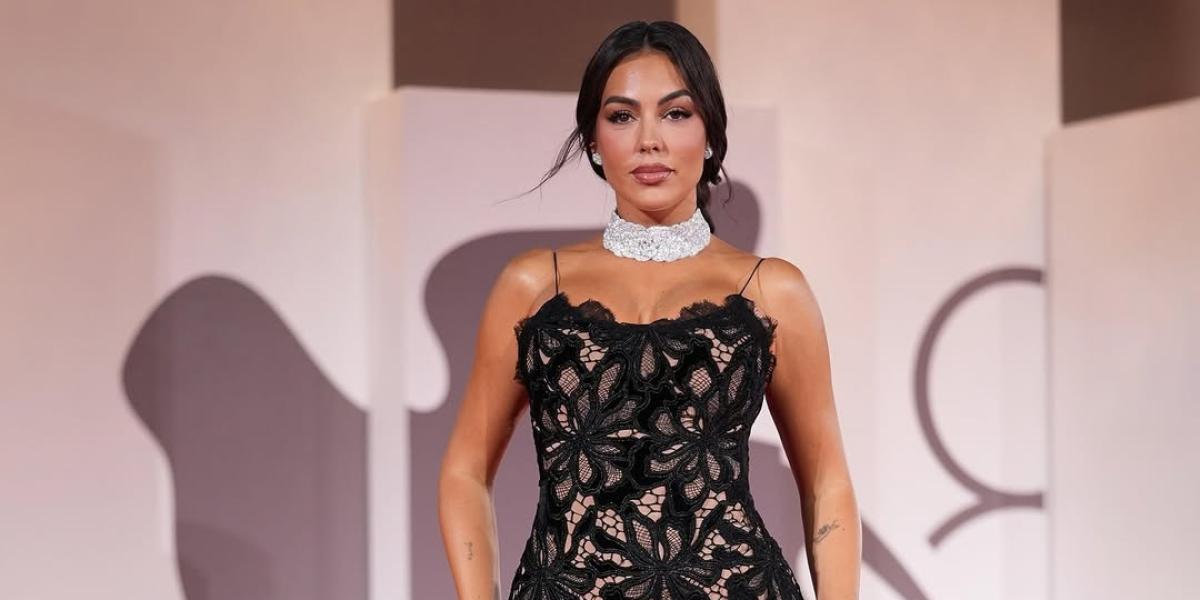 خلال مشاركتها في مهرجان فينيسيا السينمائي الدولي 2025، خطفت جورجينا رودريغيز الأنظار بإطلالة سوداء فاخرة حملت توقيع دار Roberto Cavalli. الفستان المخملي جاء بقصة مجسّمة تبرز قوامها، مزدانًا بتطريزات الورود المفرغة التي كشفت عن طبقة داخلية بلون لحمي، مع ذيل خلفي قصير أضفى فخامة إضافية على التصميم.