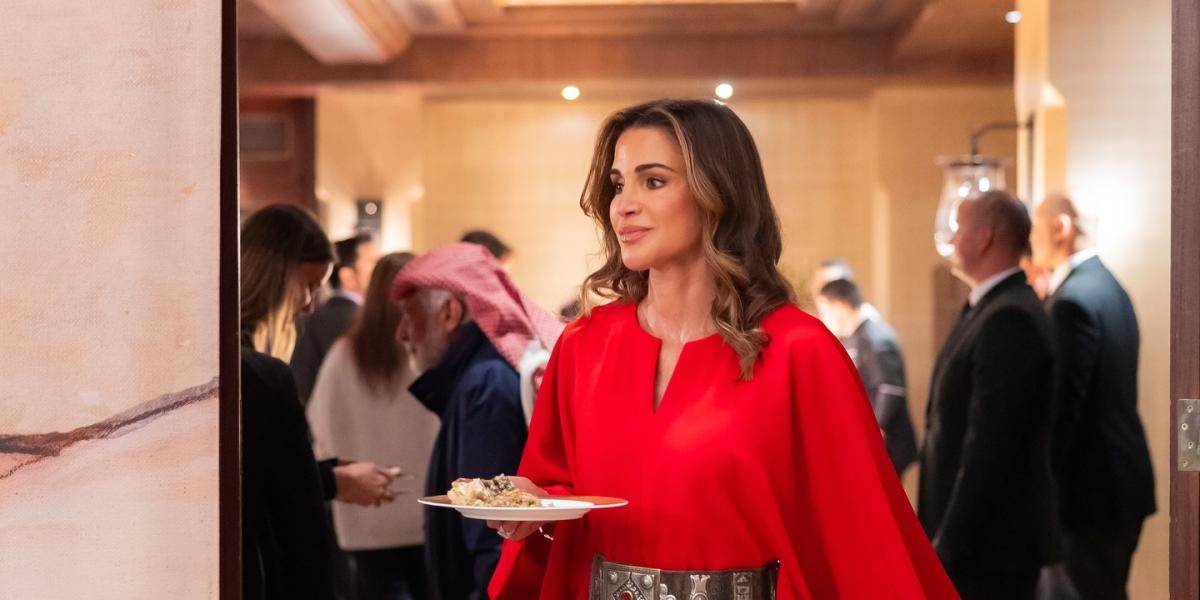 الملكة رانيا أيضًا كان لها العديد من الإطلالات الخاطفة التي سبق وأبهرتنا بها من قبل، فسبق وقد أطلت من قبل بعدة إطلالات أنيقة وجذابة تناسب الأجواء الرمضانية، ومن بينها عندما اختارت الظهور بإطلالة باللون الأحمر لحضور افطار مع النشميات، حيث توهَّجت بزي رمضاني مميز عبارة عن ثوب يعلو الكاحل بتصميم مريح يخفي ملامح القوام، بأكمام طويلة وياقة مستديرة مع حزام مطرز بالخرز الأزرق وأرفق الثوب بعباية مفتوحة مصممة بنفس القماش الرقيق والشفاف باللون الأحمر الممزوج بلمسة الأزرق الملكي، من خلال التطريزات التراثية التي تحدد حوافه، مع أشكال هندسية متناثرة على الأكمام التي اتخذت قصة الخفاش، وجاءت تلك القطعة بقصة أطول من الفستان، وأكملت الملكة إطلالتها براعة من خلال تنسيق حذاء كلاسيكي مدبب من المخمل باللون الأزرق الملكي، مع حمل كلاتش بتصميم صلب، بينما تزينت بأقراط متدلية مرصعة بأحجار زرقاء