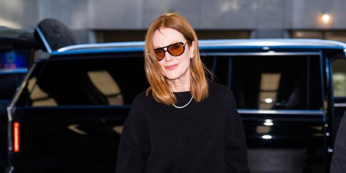 جوليان مور تخطف الانظار بإطلالاتها الأنيقة التي تتسم بطابع كلاسيكي معاصر، بستايلات وقورة، يغلب عليها اللون الأسود الذي يطغى على اختياراتها، كما أنها تواكب صيحات متجددة تناسب ذوقها وتبرز أناقتها دون أي مبالغة، ونذكر إطلالة جوليان مور بإطلالة من توقيع دار Schiaparelli، عبارة عن طقم أسود، مكون من بلوزة مريحة مزينة بأزرار مع ياقة تنسدل منها الشراشيب، وتنورة ماكسي بتصميم مائلة، انسدل الجزء السفلي منه على شكل شراشيب طويلة، وقد انتعلت نجمة هوليوود حذاء ميتاليك من الذهب، كما نسقت أقراط ذهبية متناغمة مع طلتها وتركت شعرها منسدلا.