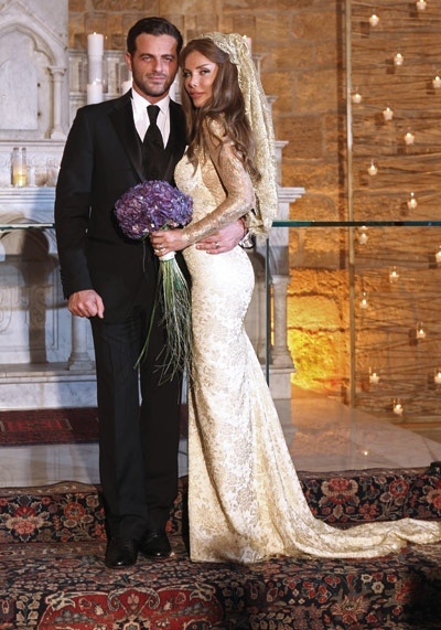 الفنانة نيكول سابا والتي تحولت صداقتها القديمة مع الممثل الشاب يوسف الخال الى علاقة حب، اختارت ان تطل في ليلة عرسها بفستان ضيق ومطرّز بالدانتيل الذهبي، وهو من تصميم اللبناني رامي القاضي.