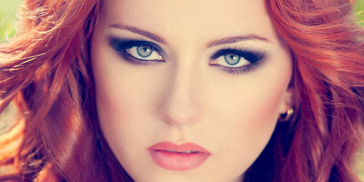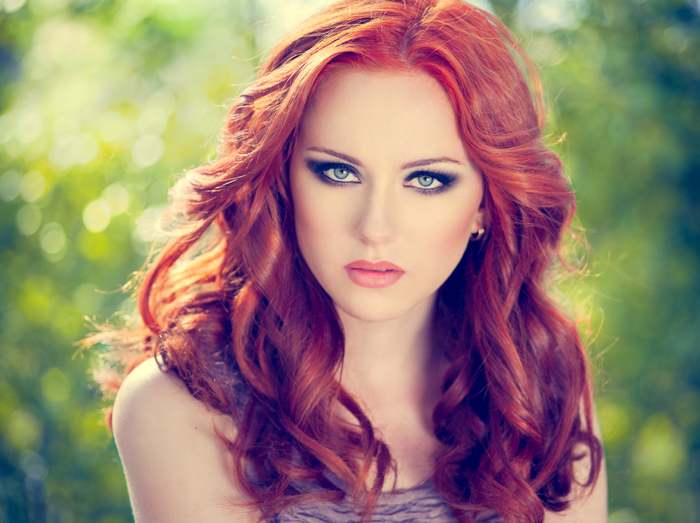 الشعر الأحمر: ضعي اللون البني المشرق أو المائل الى الإحمرار على شفتيك والبودرة المشمشية أو الزهرية الخفيفة، والماسكارا البنية والظلال البيج المحروقة.
