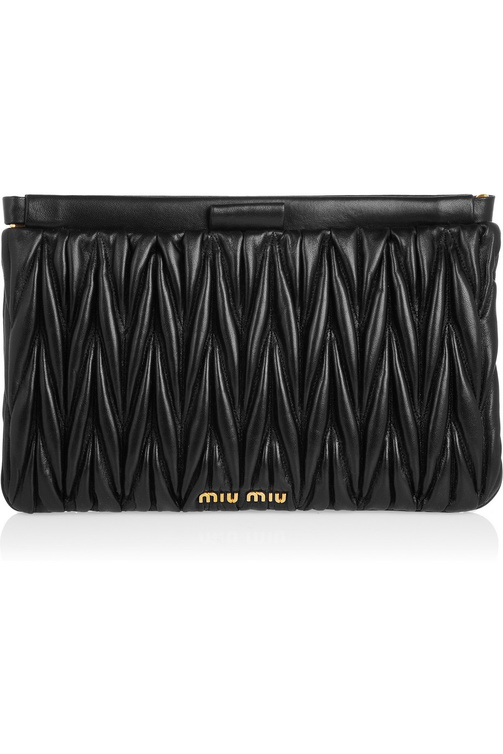 -أما الحقيبة التي إخترناها فهي "كلاتش" أسود اللون بتوقيع Miu Miu ، مصنوعاً من الجلد الناعم ويميز بطياته الهندسية الشكل .انه قمة في الأناقة ومكمل رائع لهذه الإطلالة.