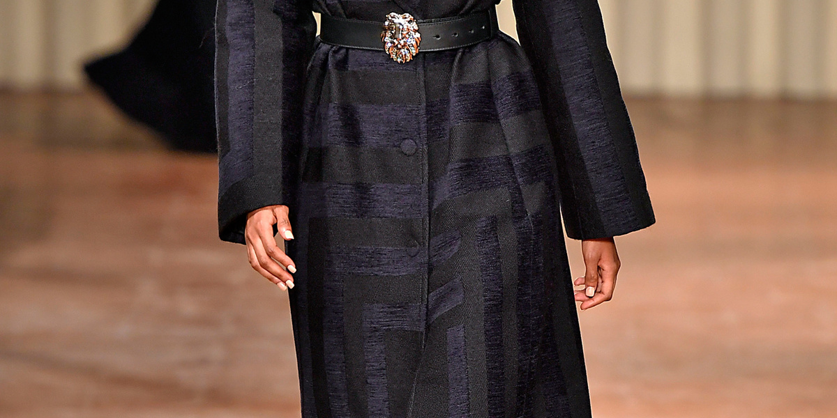 معطف أسود طويل مع نقشات مربعة باللون الأزرق الداكن أنيق للغاية وبتصميم مبتكر مع زر واحد عند وسطه.