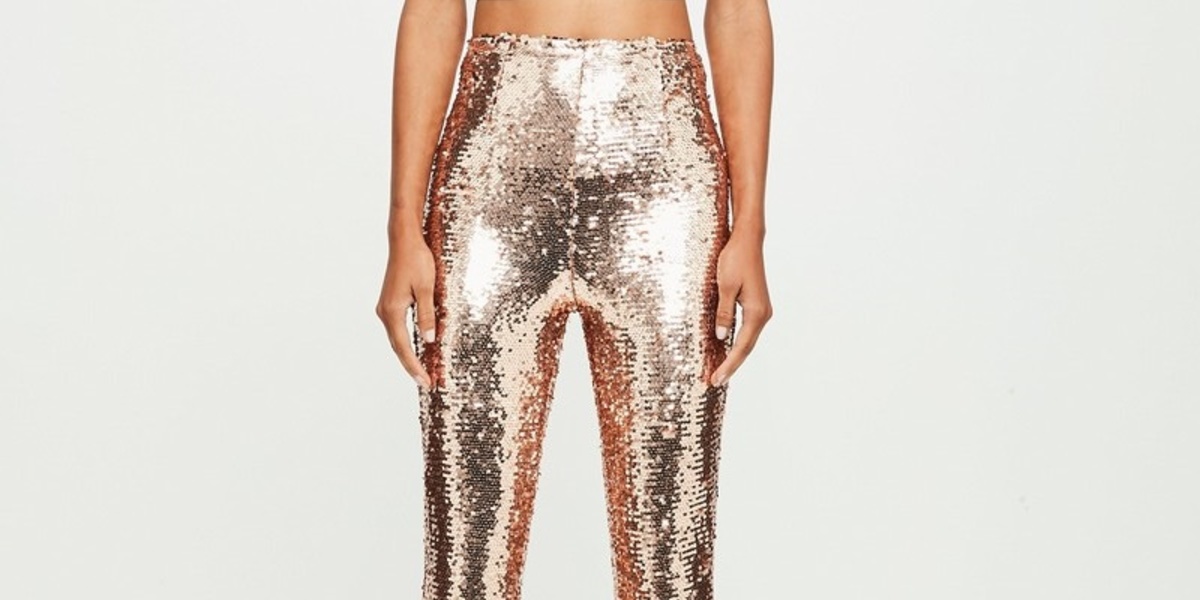 بنطلون من "هالبيرن" Halpern مصنوع من قماش البوليستر المغطى بشكل كامل بحبات الترتر البراقة التي تجمع ألوانها بين الزهري والأحمر، قصة البنطال عصرية حيث أن خصره عالي وأرجله واسعة من الأسفل بشكل مستوحى من السبعينات.
