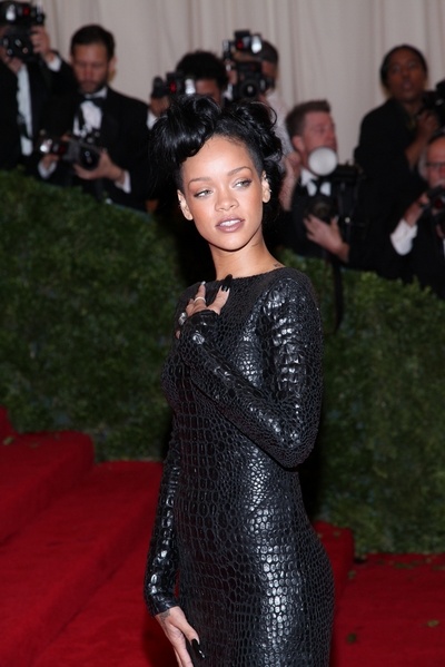 عندما ظهرت Rihanna بهذا الفستان للمرة الأولى فى حفل Met Costume Institute Gala بدت غريبة فى أعين الكثيرين، فالفستان أطول مما اعتادت عليه ريهانا وبأكمام طويلة، ولكن بعد قليل أدرك الجميع أنه المطلوب تماما لإبراز رشاقتها وأناقتها بعدما لاحقتها الاتهامات بأنها لا تجيد إلا ارتداء الملابس المكشوفة. وحرصت ريهانا على عدم الإفراط فى إضافة الملحقات فاكتفت بحذاء أسود من Christian Louboutin.