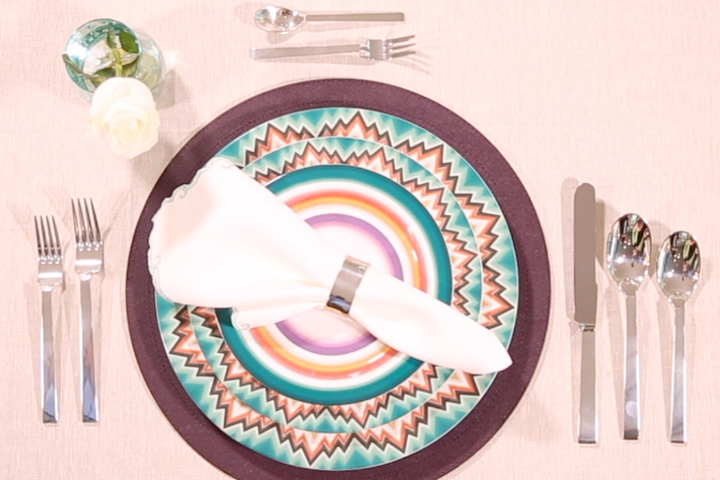 - اختاري منديل مطرز بألوان الصحون مع حلقة فضية تلائم أدوات الطعام